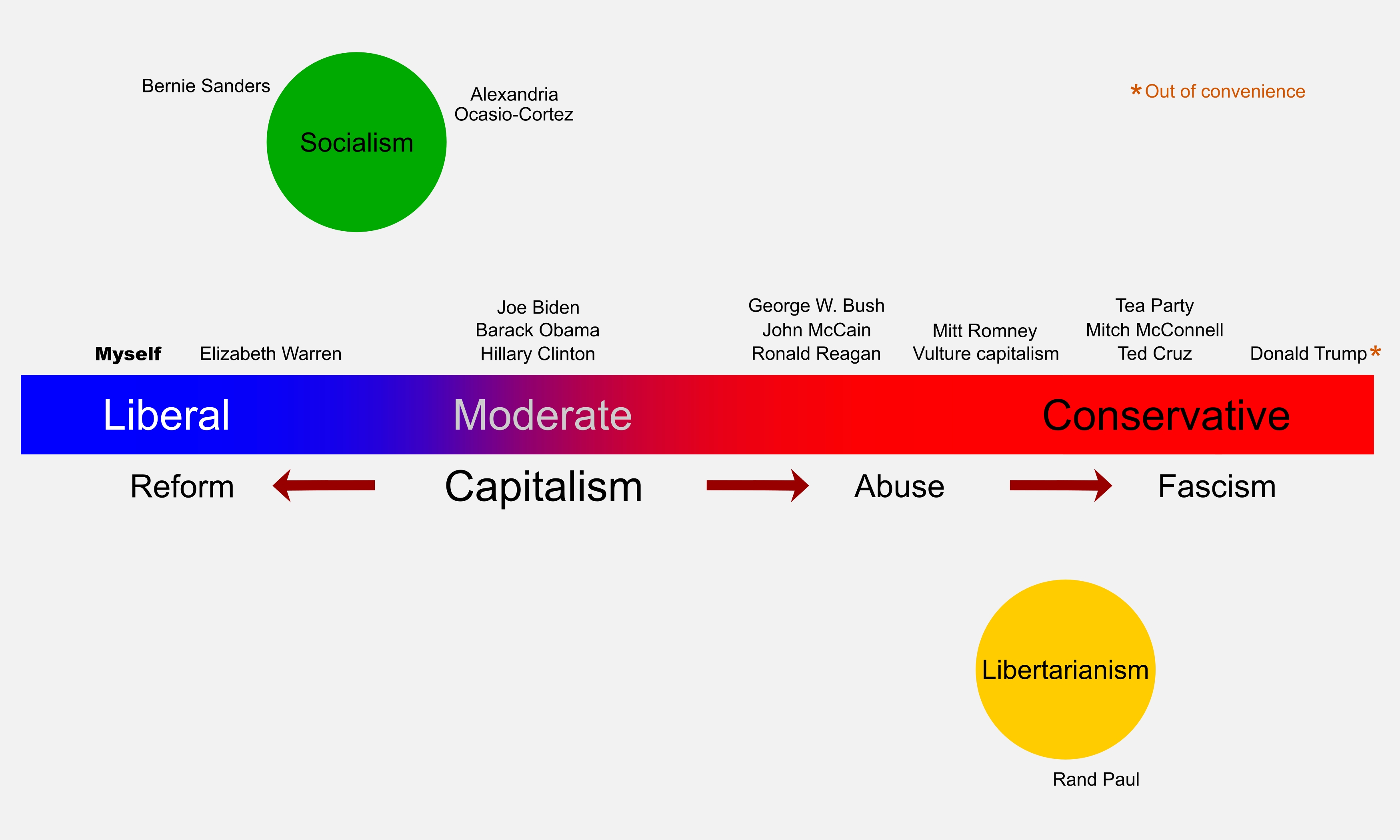 As a picture is worth a thousand words, let me start with an illustration of how I see the political spectrum and where I place myself on it (click to enlarge).